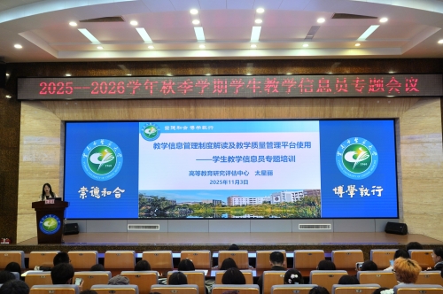 (高等教育研究评估中心 讯)为进一步完善学校教学质量监控体系,强化学生在教学质量保障中的主体作用,畅通教学信息反馈渠道,2025年11月4日晚,学校教学督导委员会办公室在呈贡校区翰墨楼一楼报告厅召开2025-2026学年秋季学期学生教学信息员专题会议。学校教学督导委员何丹、崔茂应,高等教育研究评估中心、校团委、学工部等部门领导和各学院分管教学工作的副书记、副院长出席,2024-2025学年优秀教学信息员和2025-2026学年全体新聘教学信息员参加。